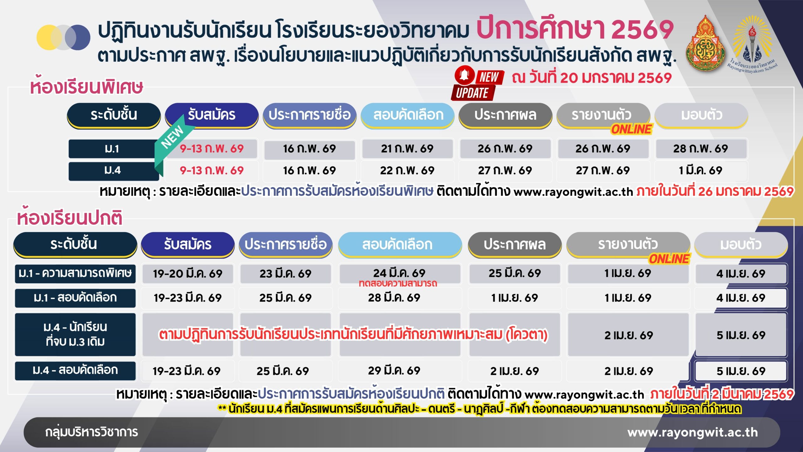 ปฏิทินงานรับนักเรียน โรงเรียนระยองวิทยาค